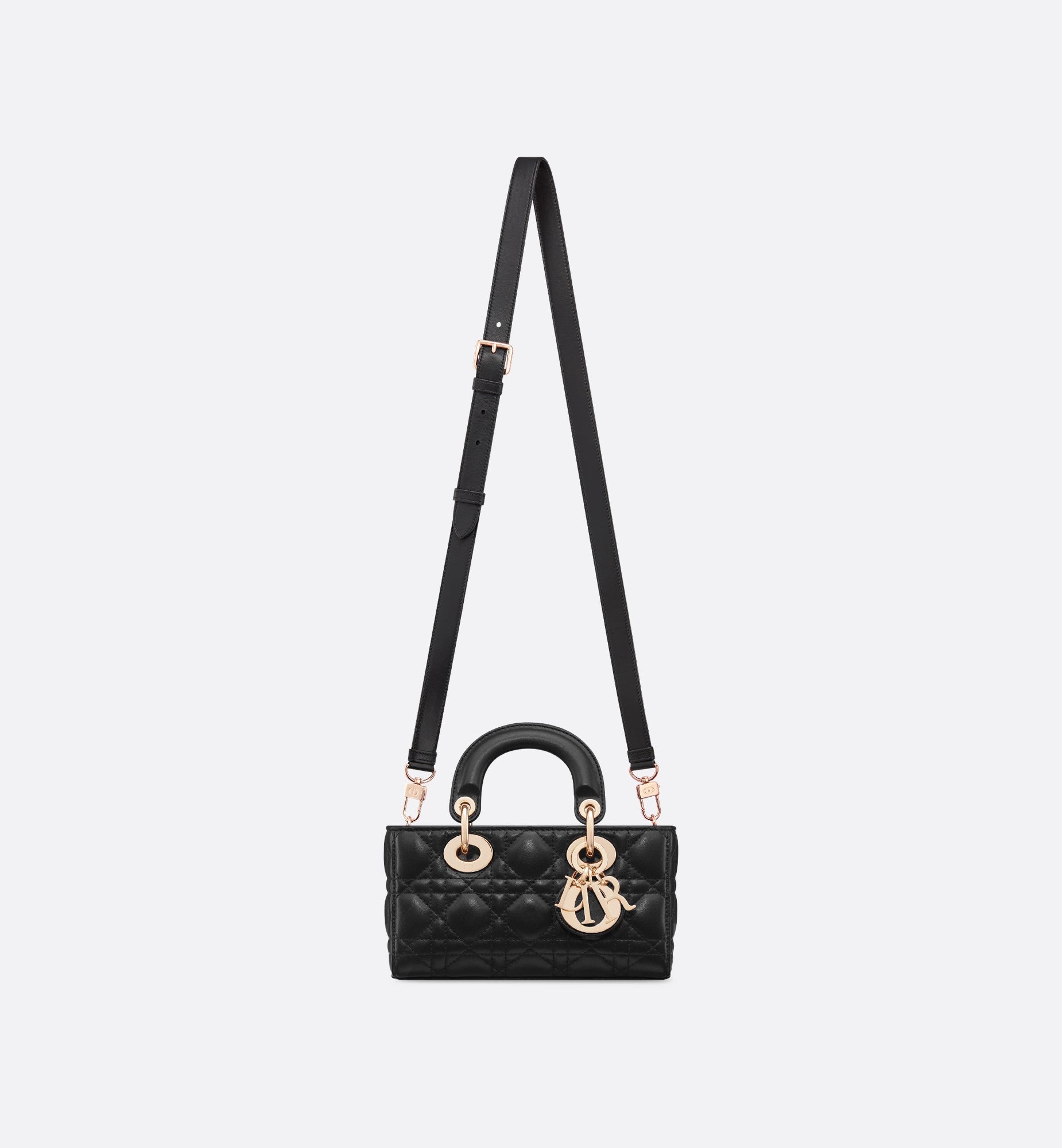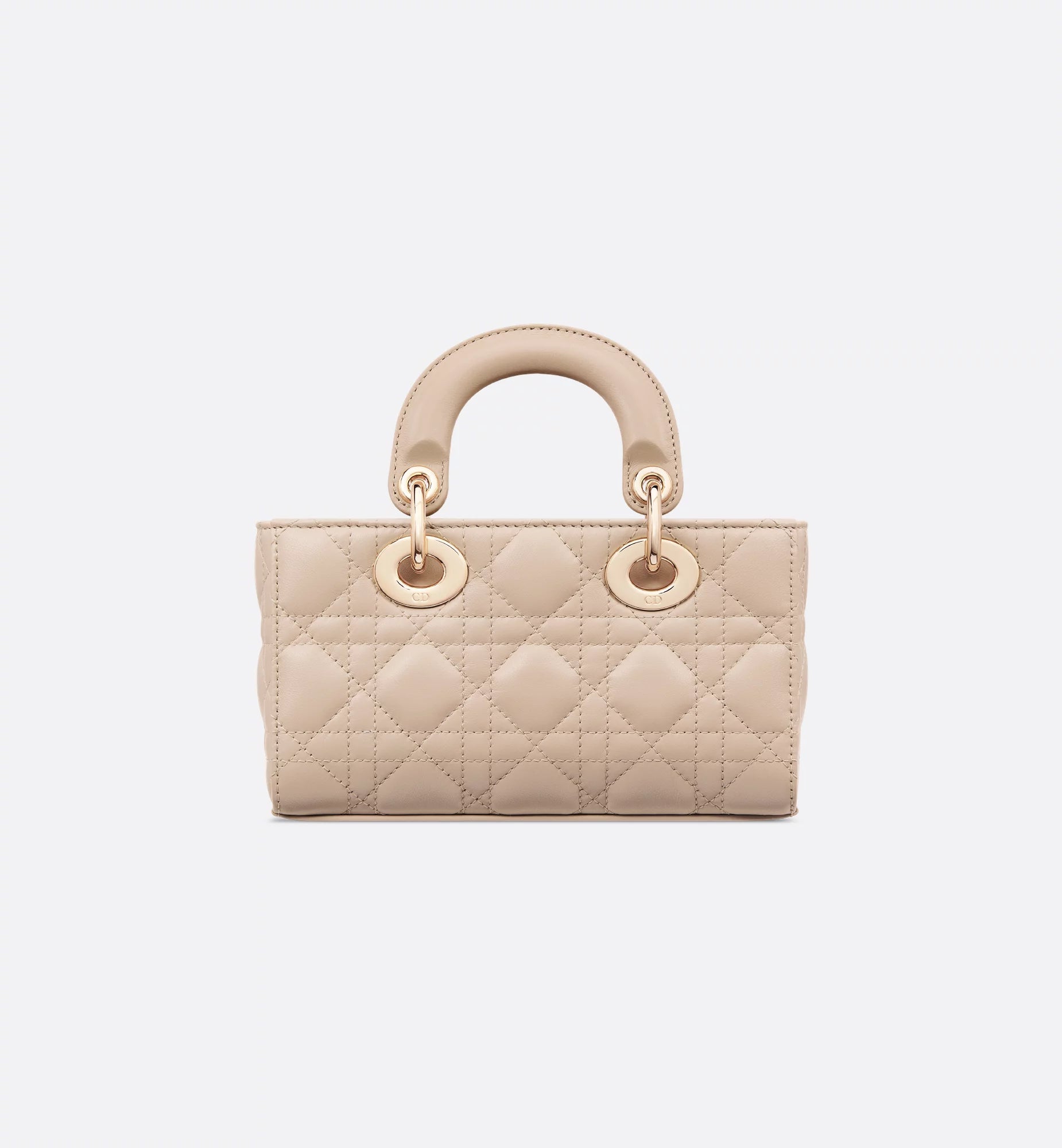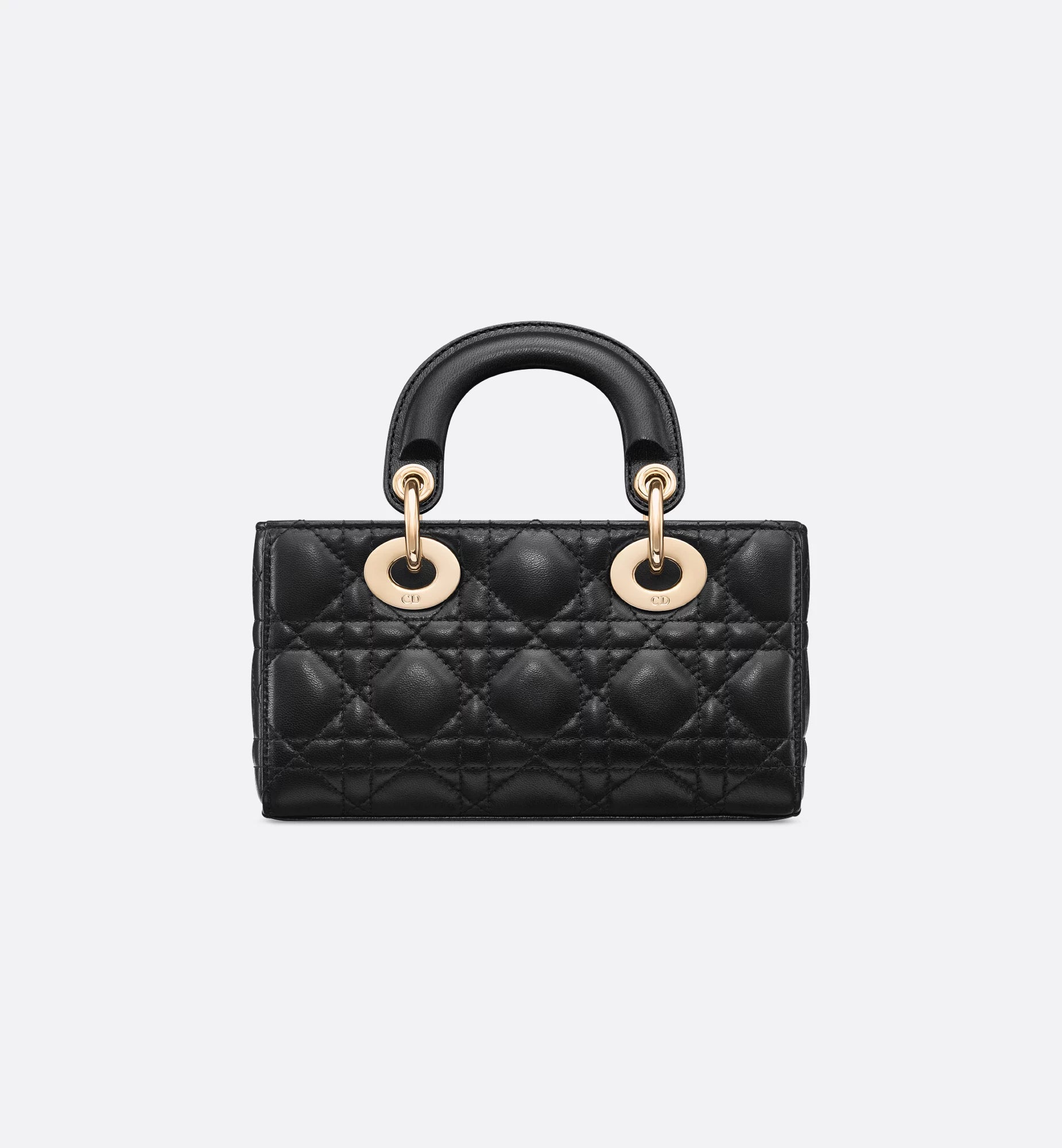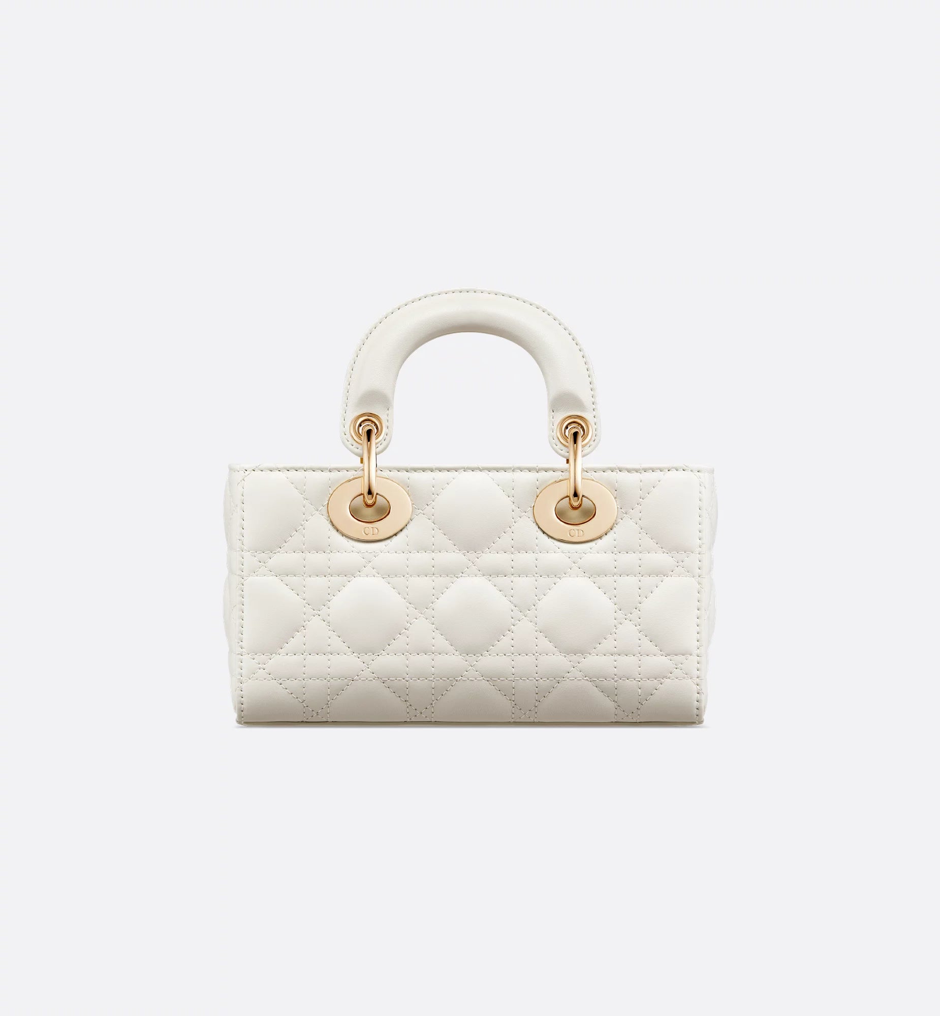 A mini, east–west version of the quilted handbag, made in leather with the signature cannage pattern. It has two top handles and comes with two detachable chains (one short for shoulder, one longer for crossbody), plus a removable leather strap, so you can wear it hand-held, on the shoulder, or across the body. The zip-top opens to a fabric-lined interior sized for cards, keys, lipstick, and AirPods, and it’s finished with metal letter charms at the handle. Approx. size (Mini): 20 × 9.5 × 4 cm (length × height × depth).