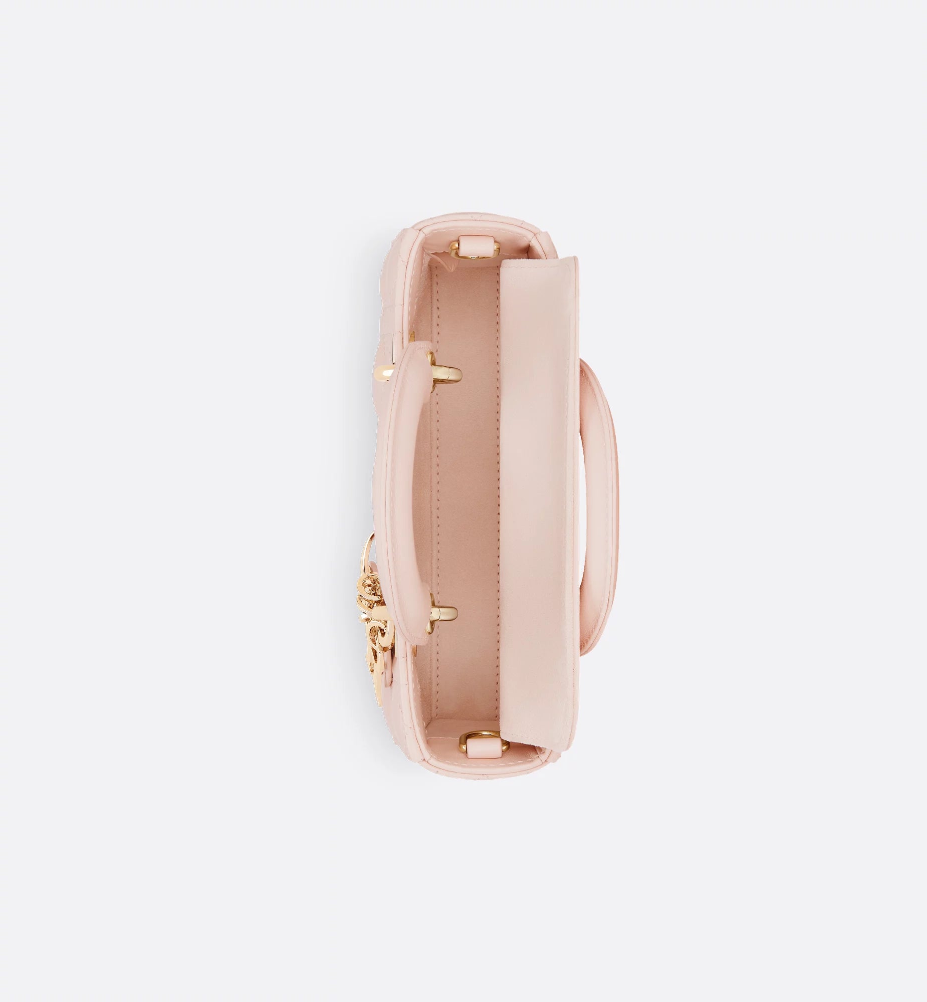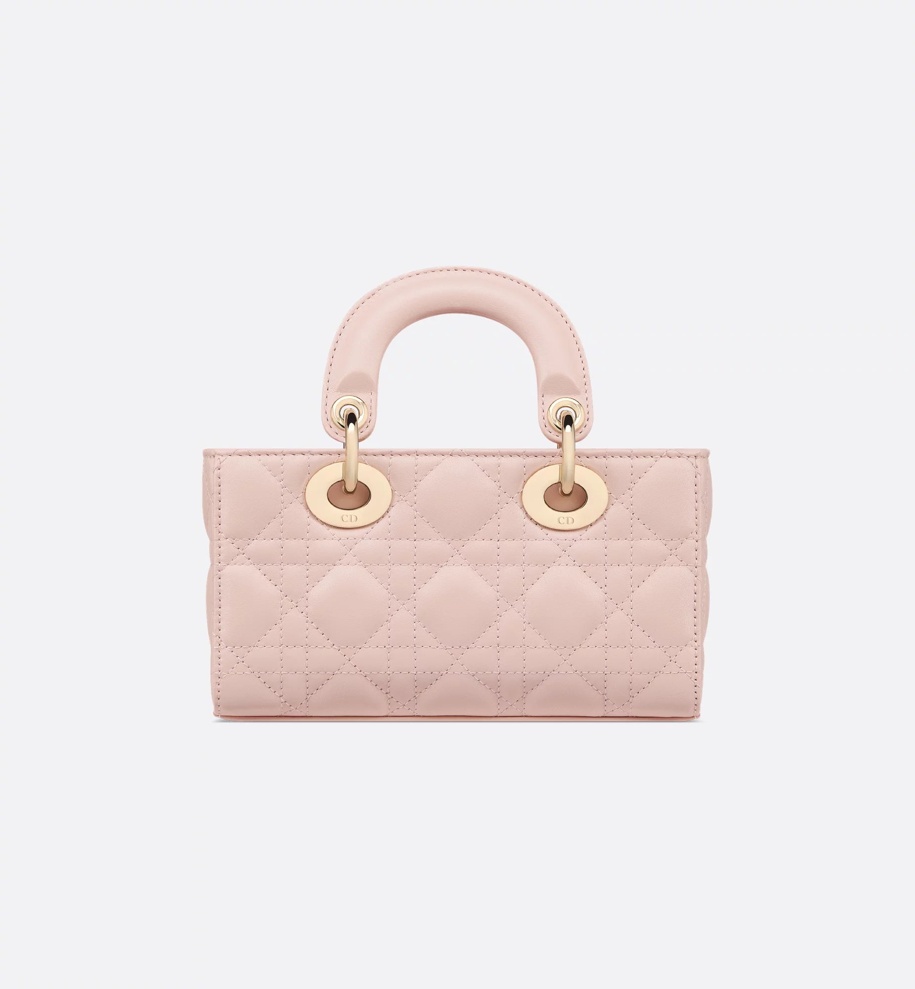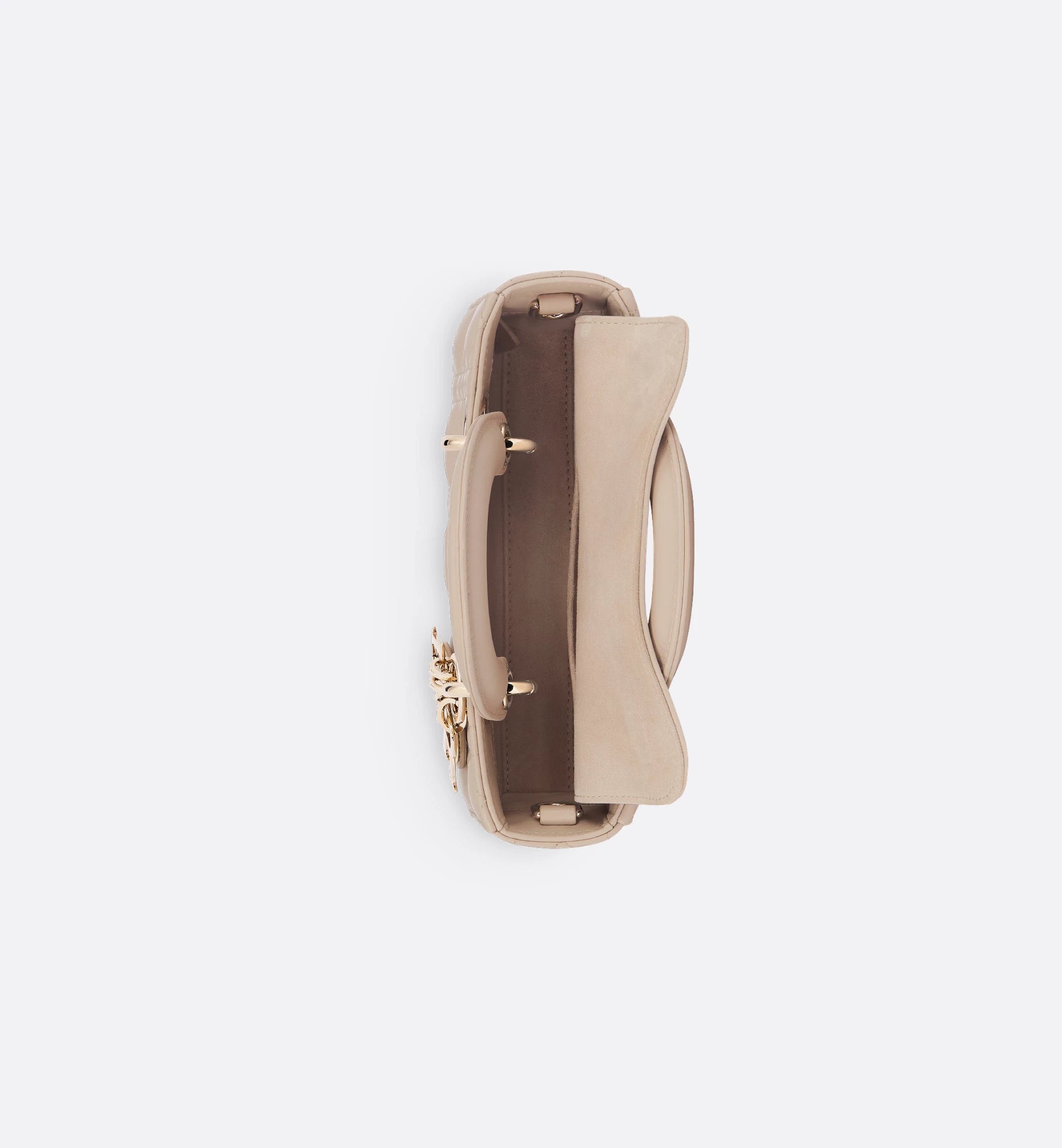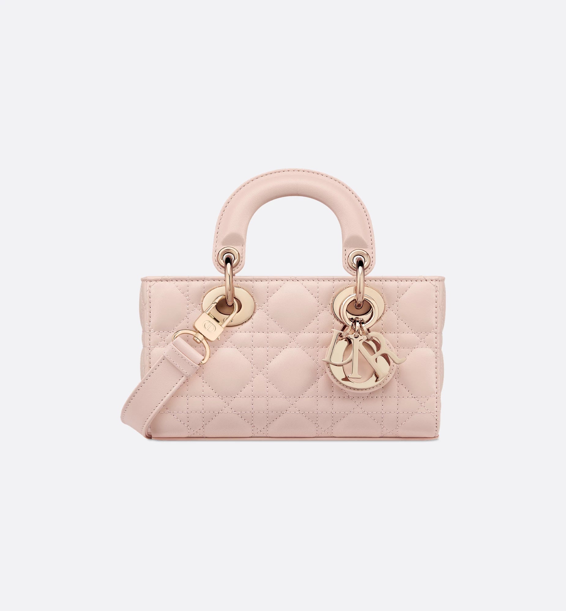 A mini, east–west version of the quilted handbag, made in leather with the signature cannage pattern. It has two top handles and comes with two detachable chains (one short for shoulder, one longer for crossbody), plus a removable leather strap, so you can wear it hand-held, on the shoulder, or across the body. The zip-top opens to a fabric-lined interior sized for cards, keys, lipstick, and AirPods, and it’s finished with metal letter charms at the handle. Approx. size (Mini): 20 × 9.5 × 4 cm (length × height × depth).